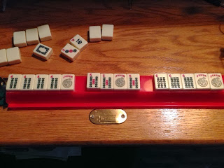 I was so happy - I picked up my tiles and there were three jokers! After the first left I was in pretty good shape. I should have stopped it there as there were some solid possibilities - the consecutive run with two dragons, the "sandwich hand" with pairs of fives in the middle, or maybe even a quint.